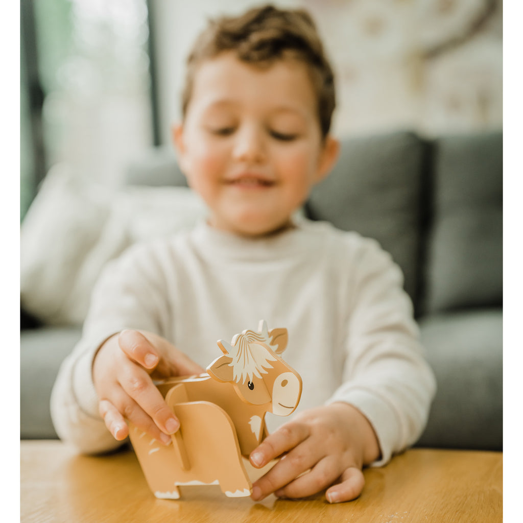 • Slot the pieces together to create a free standing Highland Cow. No glue or tools required!