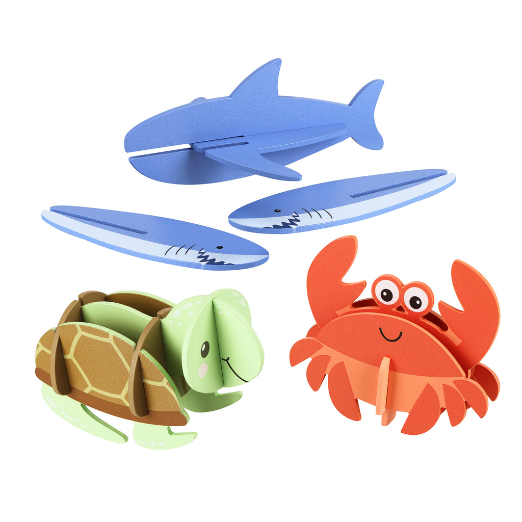 • Slot the pieces together to create 3 free-standing sea creatures. No glue or tools required!