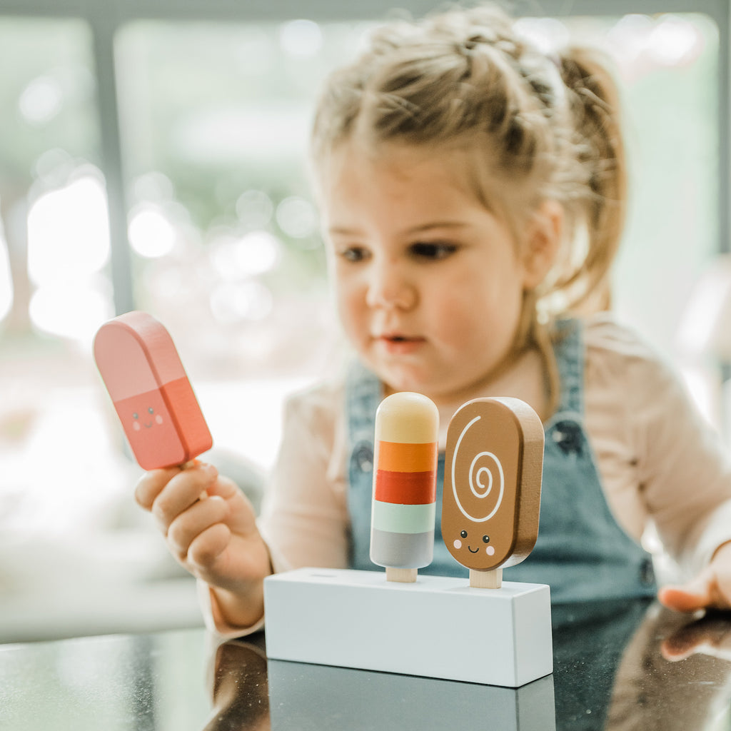 Cool down playtime with this wooden set of lollies! This charming set includes three brightly painted ice lollies & a sturdy block stand. Perfect for pretend shops, cafés, or summertime play