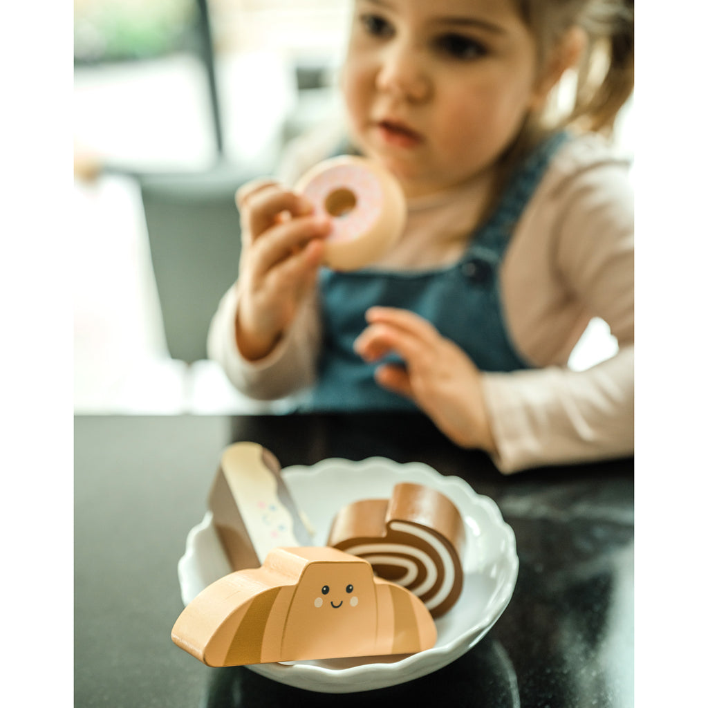 Bring the sweet treats of a bakery home with this wooden Pastry set! This delightful collection of four wooden pastries is perfect for little bakers & café owners in training