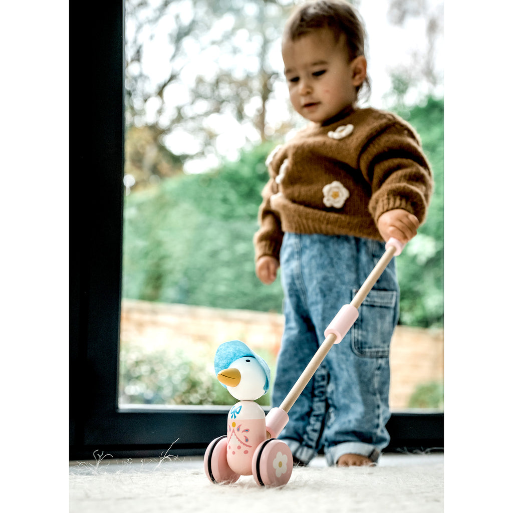 Packaged in a beautiful box, this wooden Jemima Puddle-Duck push along toy is here to help your little one find their feet!